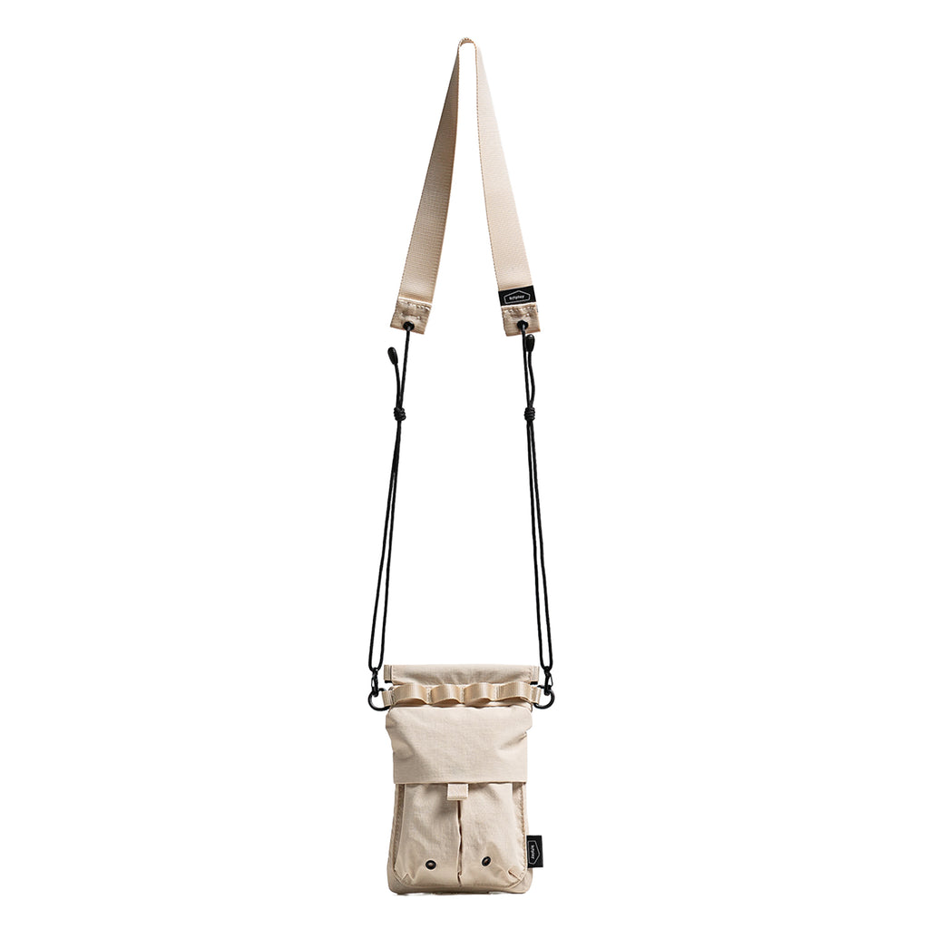ボックスプリーツ構造のフロントスナップポケットは、鍵やAirPodsの収納に十分なスペースを提供し、上部のウェビングループはペンやチャームの収納に便利です。