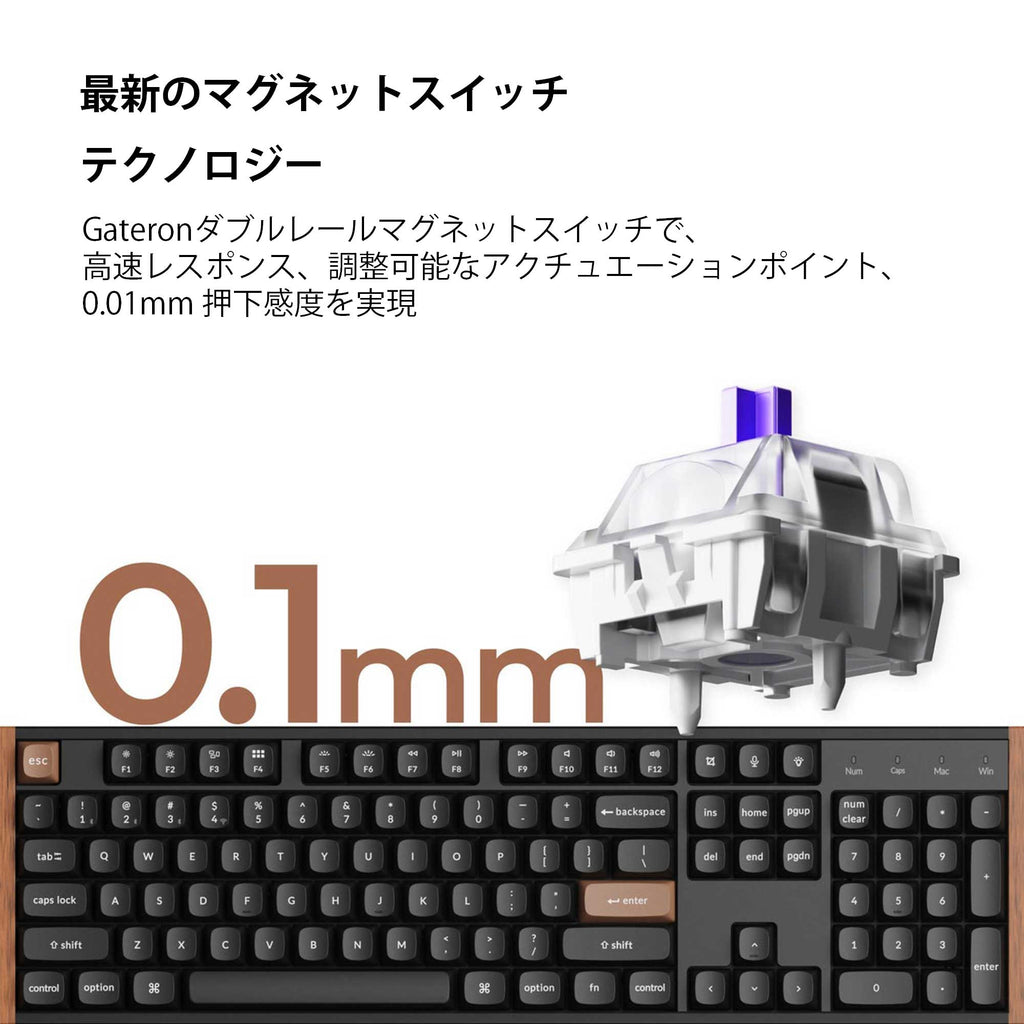 クラシックなメカニカルの打鍵感に最先端の磁気スイッチ技術を融合し、洗練されたデザインと、上質なナチュラルローズウッドのアクセントが際立つ、卓越したパフォーマンスを提供します。