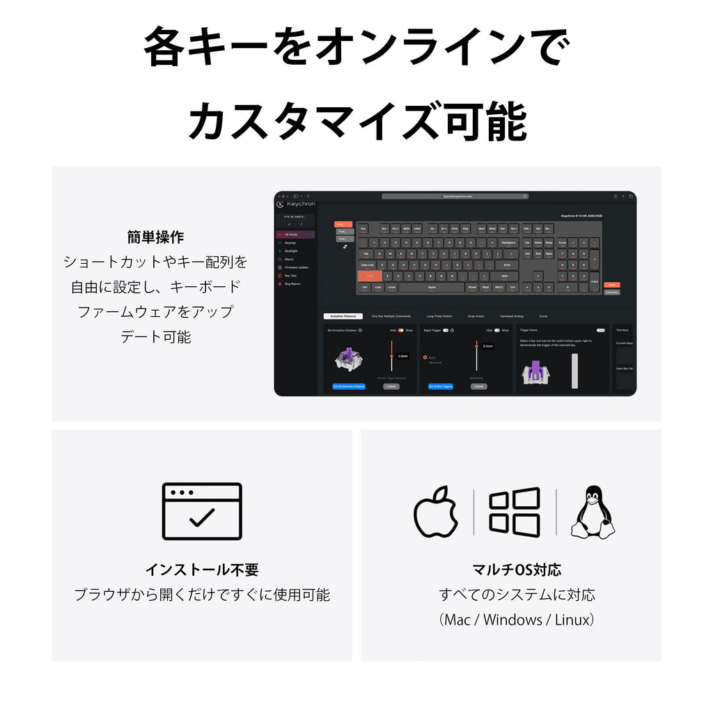 各キーのアクチュエーションポイント(作動点)を0.2mmから3.8mmまで、0.1mm単位で精密に調整可能。浅いキー押下で即座にアクションを実行し、深い押下で意図的な操作を確実に行うことで、誤入力を最小限に抑え、ゲームでもタイピングでも優れたパフォーマンスを発揮できます。