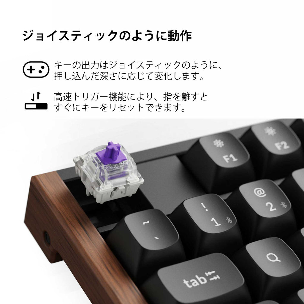 キーの作動を固定のポイントではなく、押下の深さに応じてオン・オフ可能。これにより、キーを押すと即座に作動し、離せば即リセットされるため、より高速かつ正確な入力が可能になります。高速なゲームプレイでは、複雑なアクションをリアルタイムで実行でき、スピーディーな展開でも圧倒的な優位性を発揮します。
