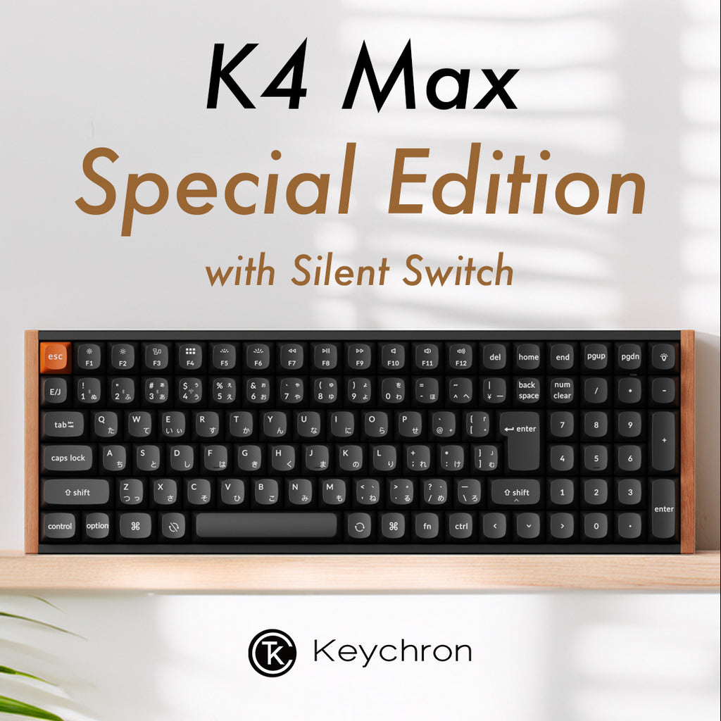 Keychronのスイッチでも常に高い人気を誇る静音スイッチSilent K Proシリーズ。K4 Maxスペシャルエディションにはそんな人気の静音スイッチの3バリエーションを搭載しています。静音赤軸、茶軸、バナナ軸。どれを選んでも音の気になる環境で、より静かにタイピングができます。オフィス、出先でのカフェ、あるいは深夜のご自宅での作業の際に、非常におすすめのスイッチです。