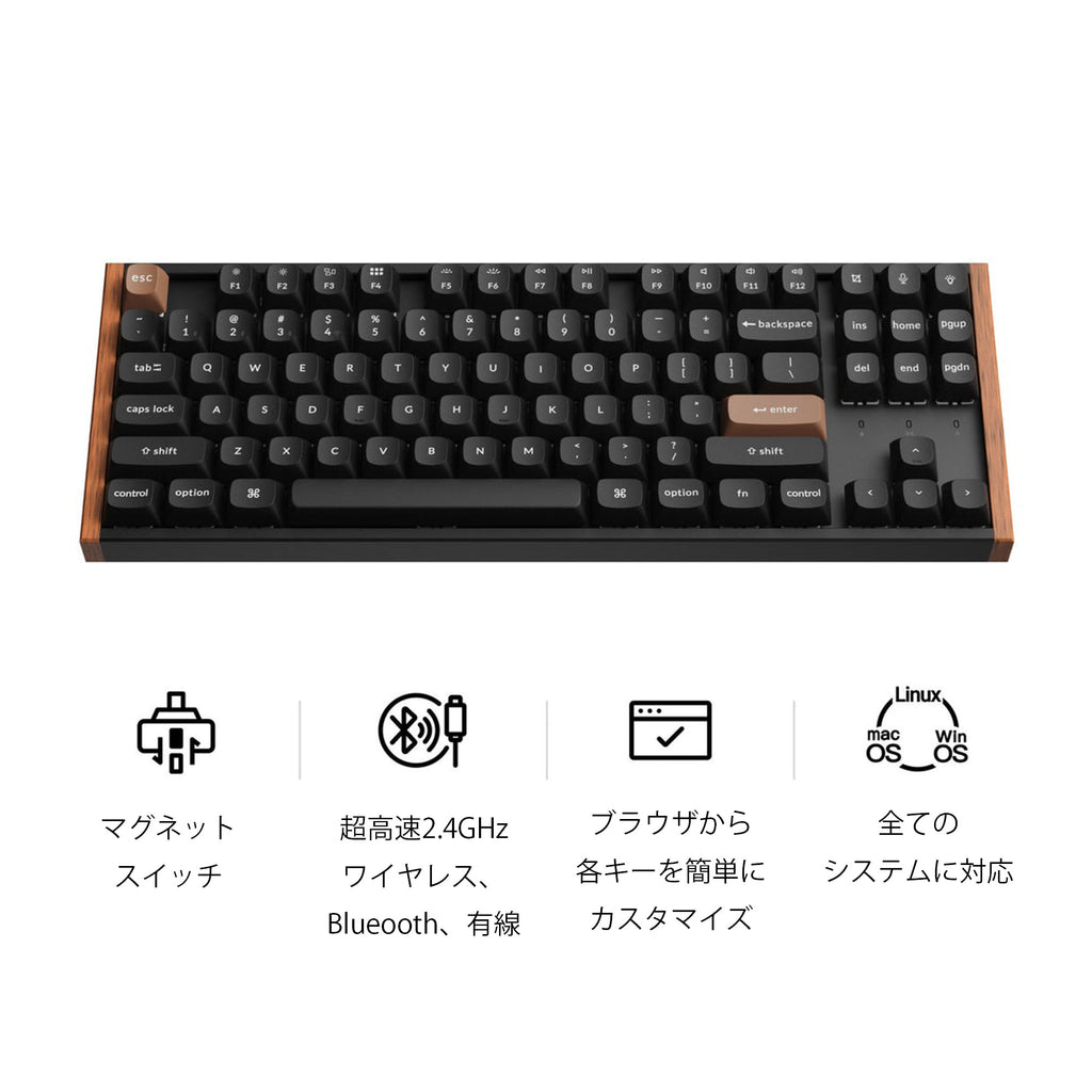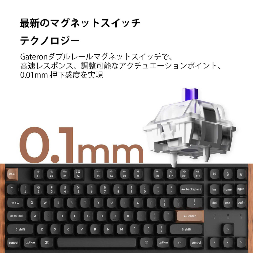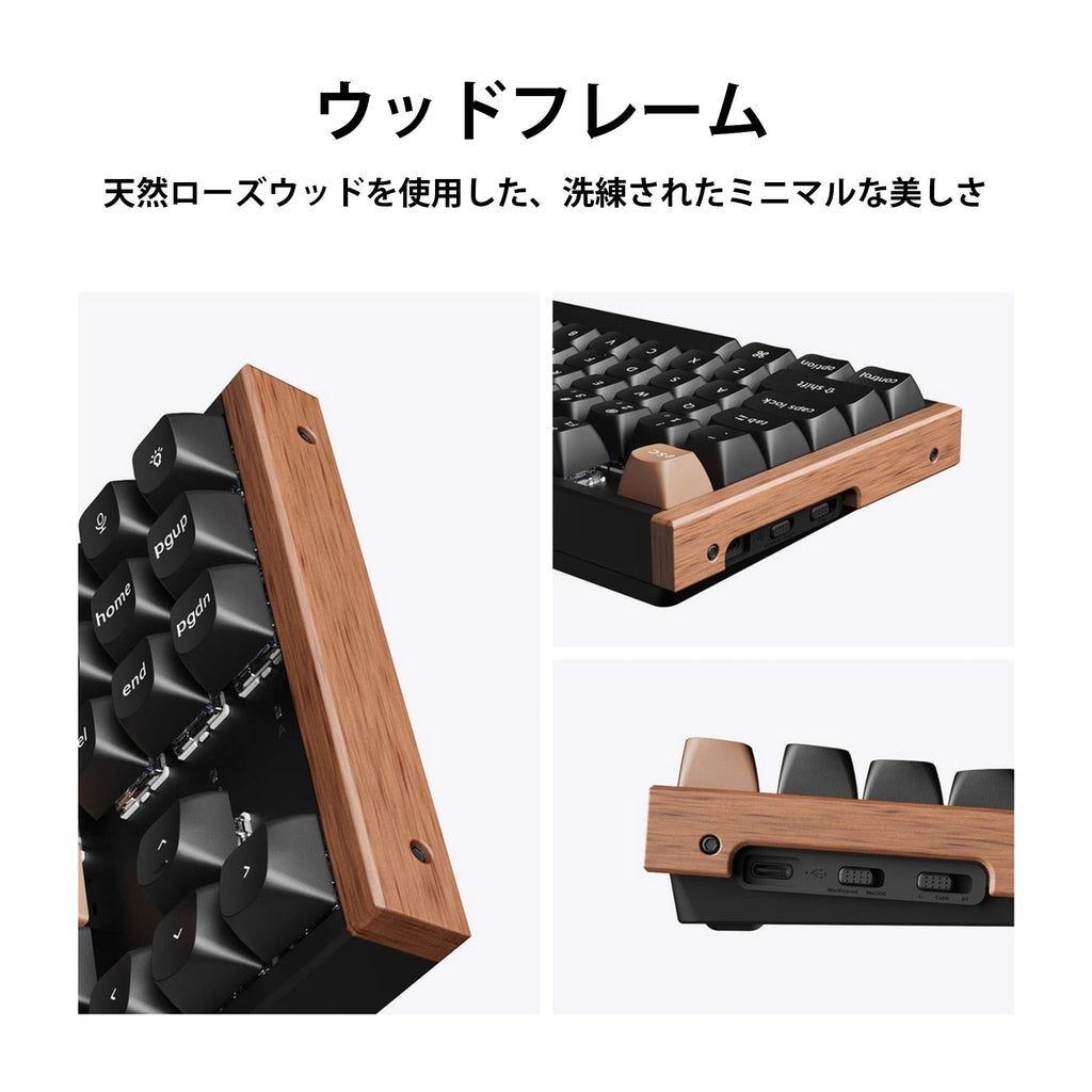 Keychron K8 HEが、あなたのゲームとタイピング体験を一新します。 従来のメカニカルキーボードの魅力と先進的な磁気スイッチ技術を融合し、クリーンでミニマルなデザインにナチュラルなローズウッドアクセントを添えた、高性能なキーボードです。