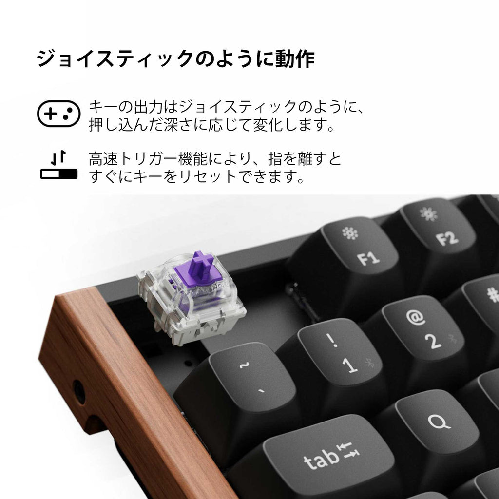 キーの作動を固定のポイントではなく、押下の深さに応じてオン・オフ可能。これにより、キーを押すと即座に作動し、離せば即リセットされるため、より高速かつ正確な入力が可能になります。高速なゲームプレイでは、複雑なアクションをリアルタイムで実行でき、スピーディーな展開でも圧倒的な優位性を発揮します。